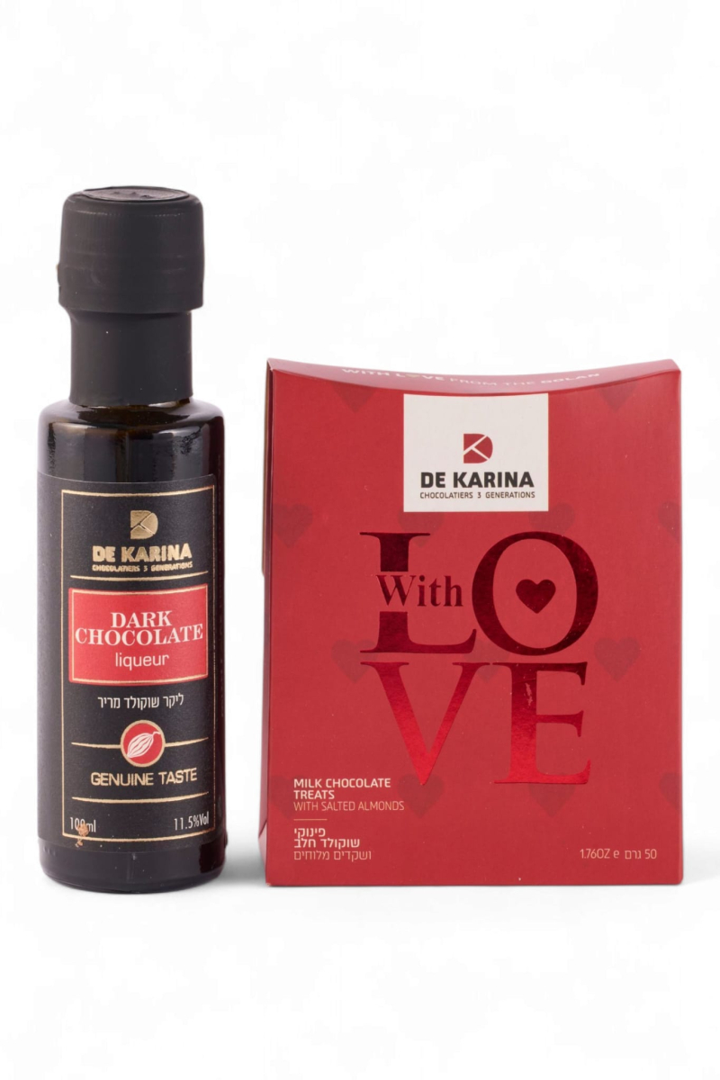 פינוקי LOVE: קולקציית ריבועי שוקולד חלב מסדרת love עם שקדים ומלח ים – חלבי, ללא גלוטן, 50 גרם. ליקר שוקולד מריר: דה קרינה ליקר שוקולד 100 מ"ל. כשר למהדרין חלב ישראל. ללא דגנים.